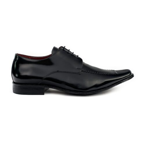 O sapato Compasso é feito em couro verniz e possui cadarço para o ajuste. Este modelo tem, na parte da frente, uma peça com detalhes em colmeia e costuras ao redor da mesma. Além disso, a palmilha é macia e o forro interno acolchoado dá mais conforto ao modelo.