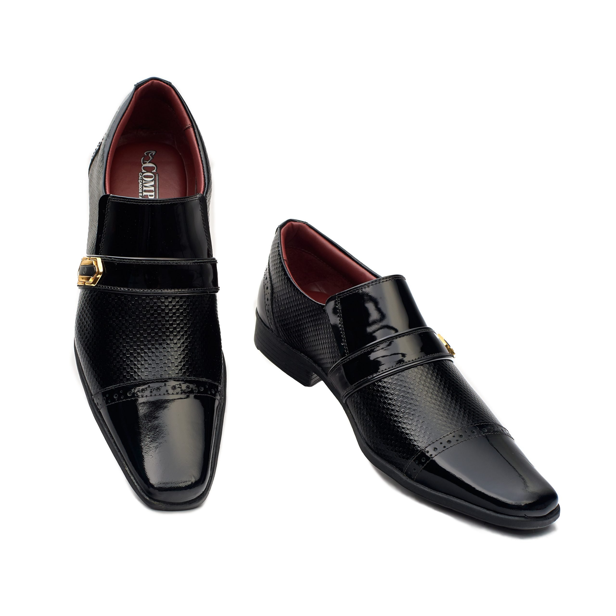 O sapato Compasso é feito em couro verniz e tem o forro interno espumado e por isso, oferece maior conforto ao andar. O modelo tem vários detalhes. Em primeiro lugar, na parte da frente, ele é em verniz liso. Em segundo lugar, ele possui uma faixa com furinhos que dão leveza e estilo ao modelo. Além disso, ele tem uma parte em verniz com textura em colmeia. Também possui um metal dourado na lateral que reforça o requinte do modelo.