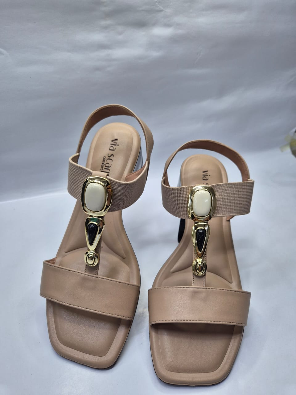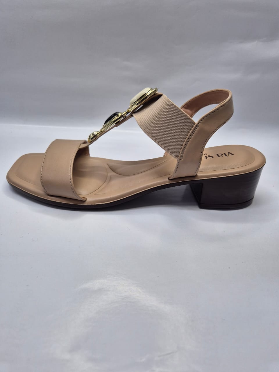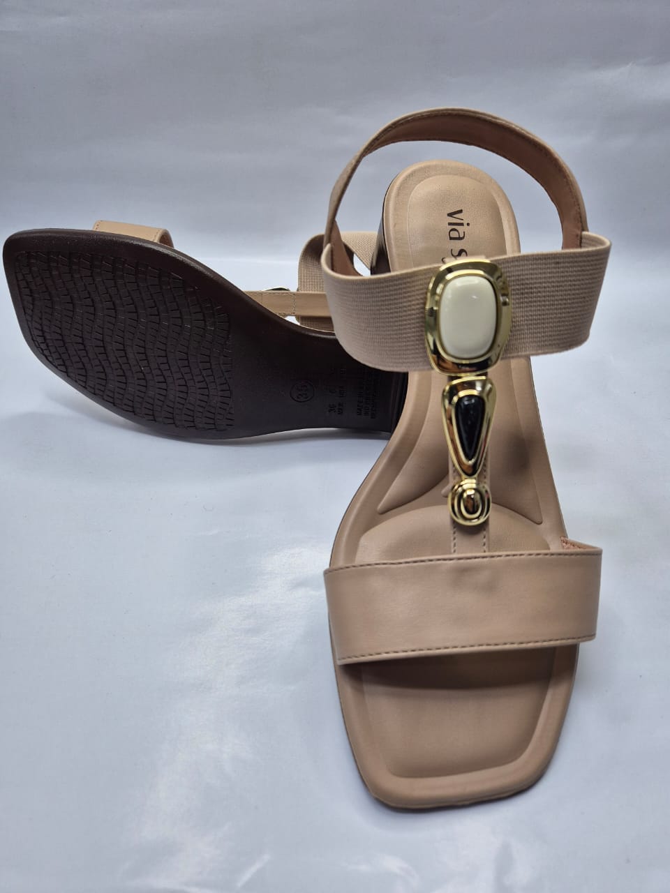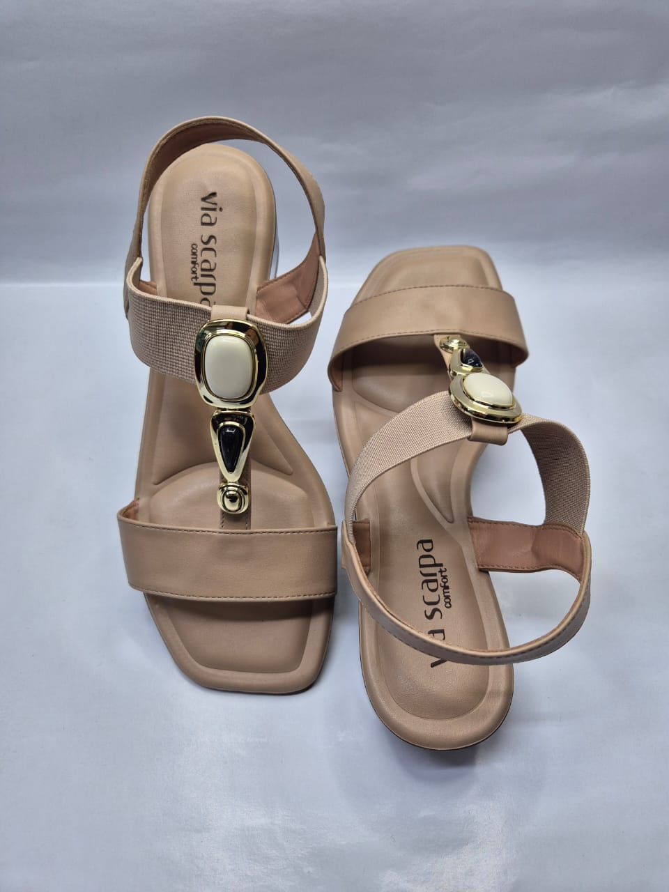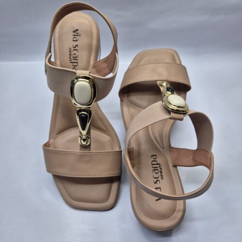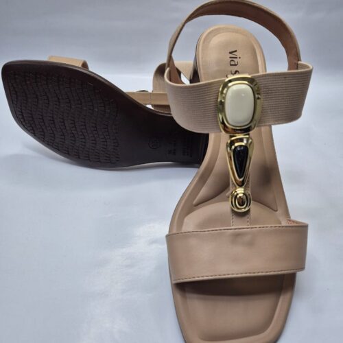 A sandália feminina Via Scarpa é feita em napa sintética de alta qualidade. Este modelo é formado por três tiras: a primeira, da parte da frente, vai de um lado ao outro do pé. A seguir, a segunda tira tem detalhe em pedraria que dá um toque de charme e sofisticação ao modelo. A terceira tira é elastica e faz o ajuste ideal ao formato do pé, fazendo com que a sandália fique firme e dê segurança aos seus movimentos.
